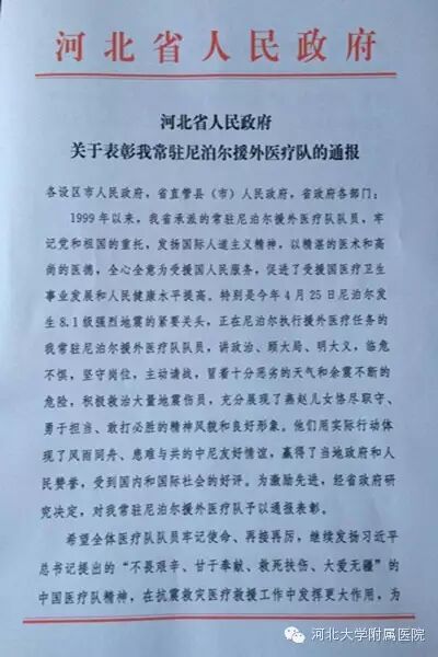 通报指出,希望全体医疗队队员牢记使命,再接再厉,继续发扬习近平总书记提出的“不畏艰辛、甘于奉献、救死扶伤、大爱无疆”的中国医疗队精神,在抗震救灾医疗救援工作中发挥更大作用,为增进中尼传统友谊作出新的更大贡献。全省各级各部门和广大干部群众要以我省常驻尼泊尔援外医疗队队员为榜样,学习他们克服困难、不怕牺牲、无私奉献的精神,尽职尽责,扎实工作,为建设全面小康的河北、富裕殷实的河北、山清水秀的河北而努力奋斗。